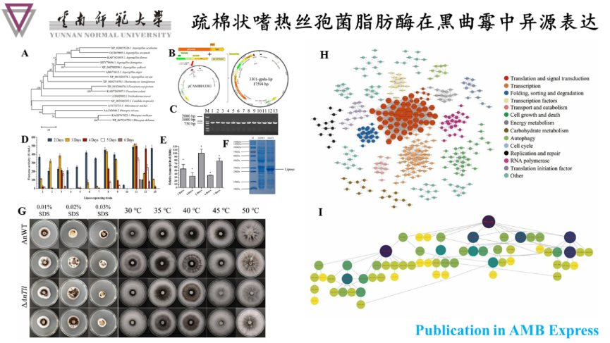 近日,我院云南特色生物资源高值化利用教育部工程研究中心黄遵锡团队在黑曲霉底盘菌株研究领域取得进展。研究团队通过异源表达嗜热真菌 Thermomyces lanuginosus 来源的脂肪酶、酶学性质分析、发酵条件优化等,系统解析了表达菌株的生长速率、抗逆性、酶学性质以及黑曲霉作为表达宿主调控外源酶/蛋白质表达的调控网络,为黑曲霉作为高效酶生产细胞工厂的优化提供了重要数据支撑。该研究成果以“Heterologous expression ofThermomyces lanuginosuslipase inAspergillus niger: stress resistance, optimization of fermentation conditions, and transcriptomic analysis”为题,发表在国际期刊AMB express 。