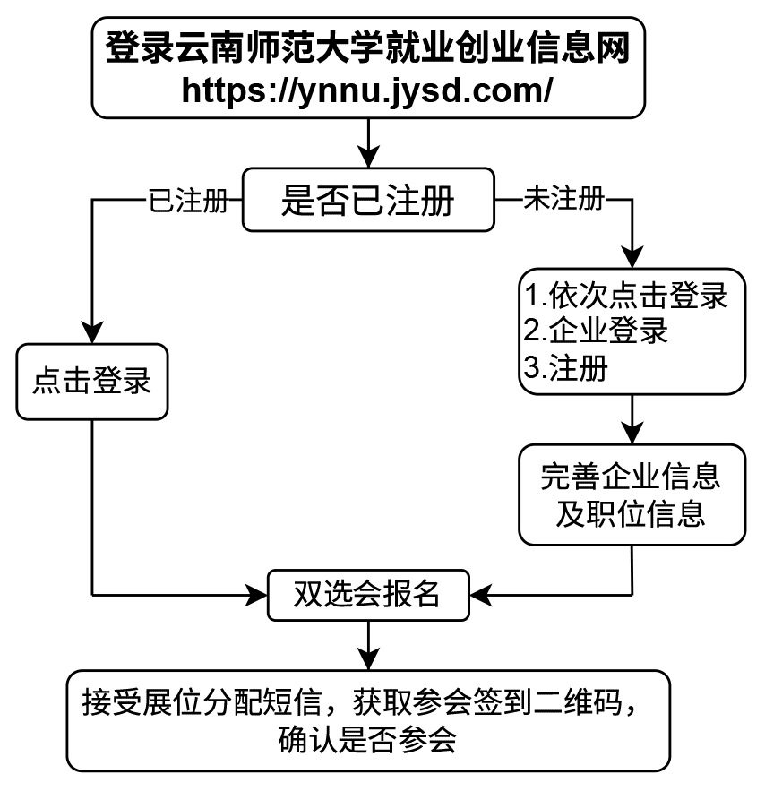 登陆云南师范大学就业信息网(https://ynnu.jysd.com/),点击“单位登录”预约招聘会。已注册的单位请直接登录系统,依次点击“招聘会、云南师范大学化学、物理、地理、生物类2026届毕业生专场招聘会”进行预约。未注册的单位请先注册,经审核后登录预约(报名流程见下图)。报名审核通过后,后续事宜另行通知,报名截止时间:2026年4月13日中午12:00。
