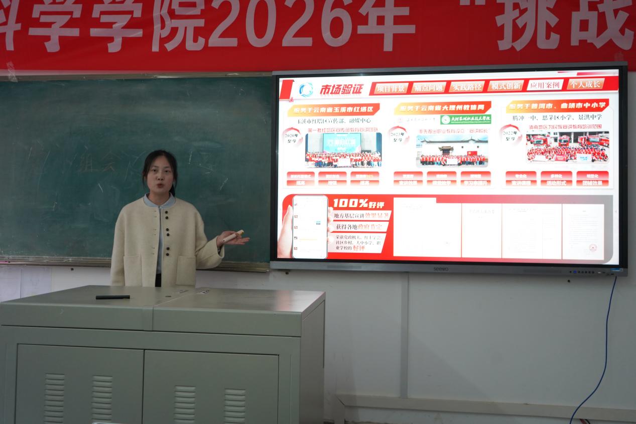 3月12日,我院2026年“挑战杯”中国大学生创业计划竞赛院级选拔赛在睿智3号楼107室成功举办。昆明兴滇科技孵化有限公司总经理钟健文、校外专家郑华老师、学院指导教师苏代发、耿伟航,以及研究生代表赵航、段鹏辉担任评委。